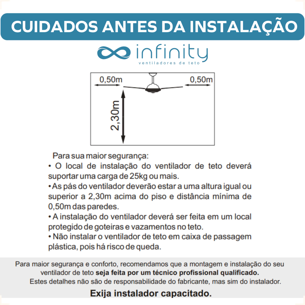 - Para uma ideal ventilação o ventilador deverá ser instalado em uma altura de 2,30m ou mais do solo e 0,50 m ou mais de distância de paredes.